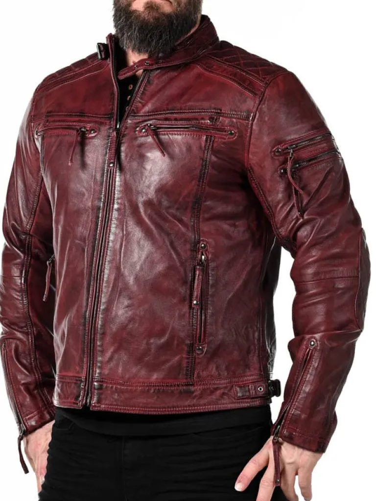 Jakke I En Læder Med Et Slidt Look, Der Er Med Til At Give Den Et Cool Udseende. Den Har Polstrede Partier Og Justérba…