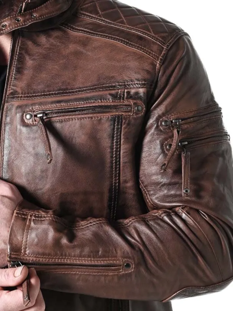 Jakke I En Læder Med Et Slidt Look, Der Er Med Til At Give Den Et Cool Udseende. Den Har Polstrede Partier Og Justérba…