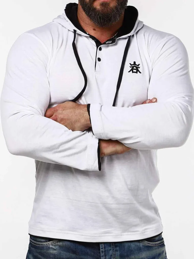 Longsleeve Med Hætte Fra hvid Longsleeve Med Sorte Detaljer. Den Har En Klassisk Pasform, Og Er Designet Med En Hætte Og En Knaplukning Fortil. Denne Unikke Longsleeve Finder Du Kun Hos !
