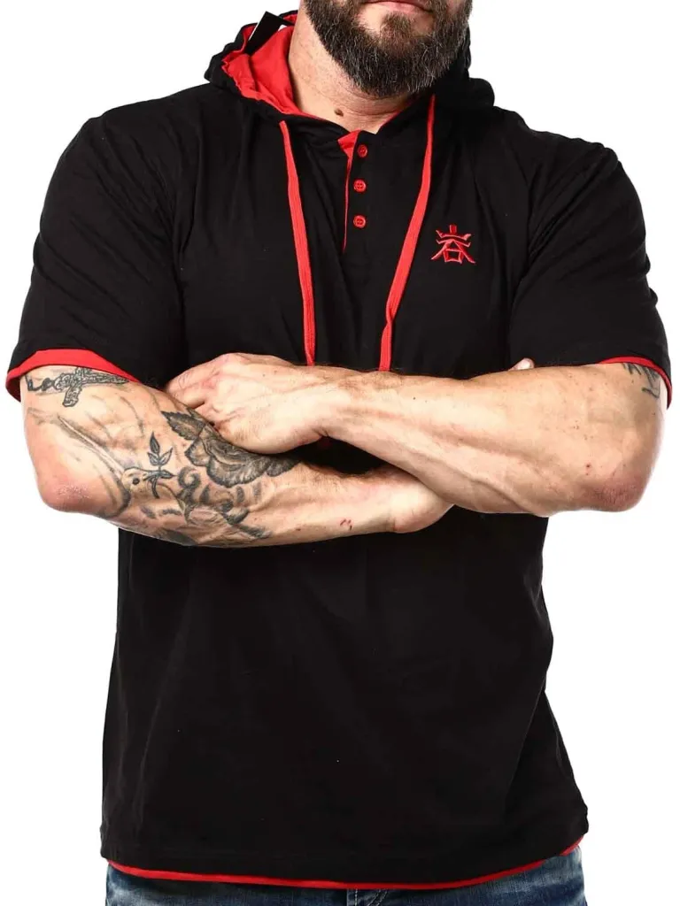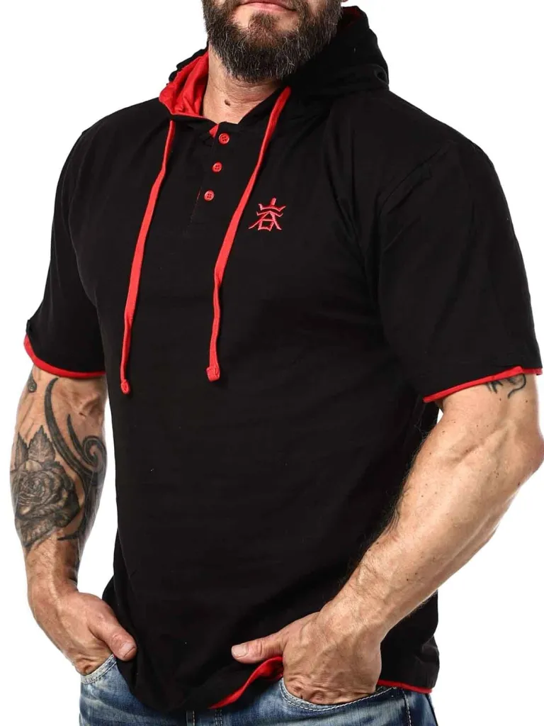T-Shirt Med Hætte Fra sort T-Shirt Med Røde Detaljer. Den Har En Klassisk Pasform, Og Er Designet Med En Hætte Og En Knaplukning Fortil. Denne Unikke T-Shirt Finder Du Kun Hos !