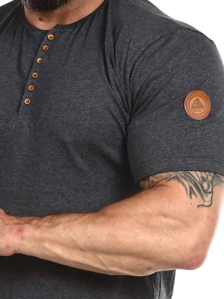 T-Shirt Med Knapper Fra her Har Vi Fremstillet Vores Egen T-Shirt I 100 % Bomuld. Den Har En Klassisk Pasform, Og Er Designet Med En Knapåbning Fortil. En Lap, Der Kommer I En Imitation Af Læder, Ses På Venstre Ærme.