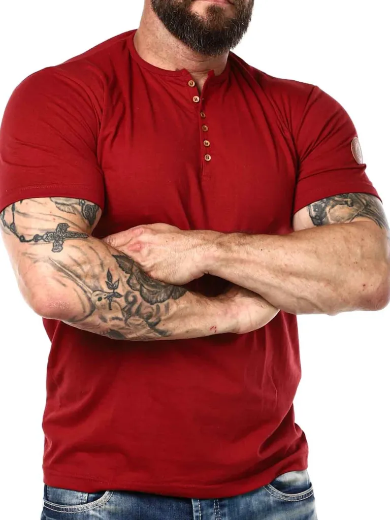T-Shirt Med Knapper Fra her Har Vi Fremstillet Vores Egen T-Shirt I 100 % Bomuld. Den Har En Klassisk Pasform, Og Er Designet Med En Knapåbning Fortil. En Lap, Der Kommer I En Imitation Af Læder, Ses På Venstre Ærme.