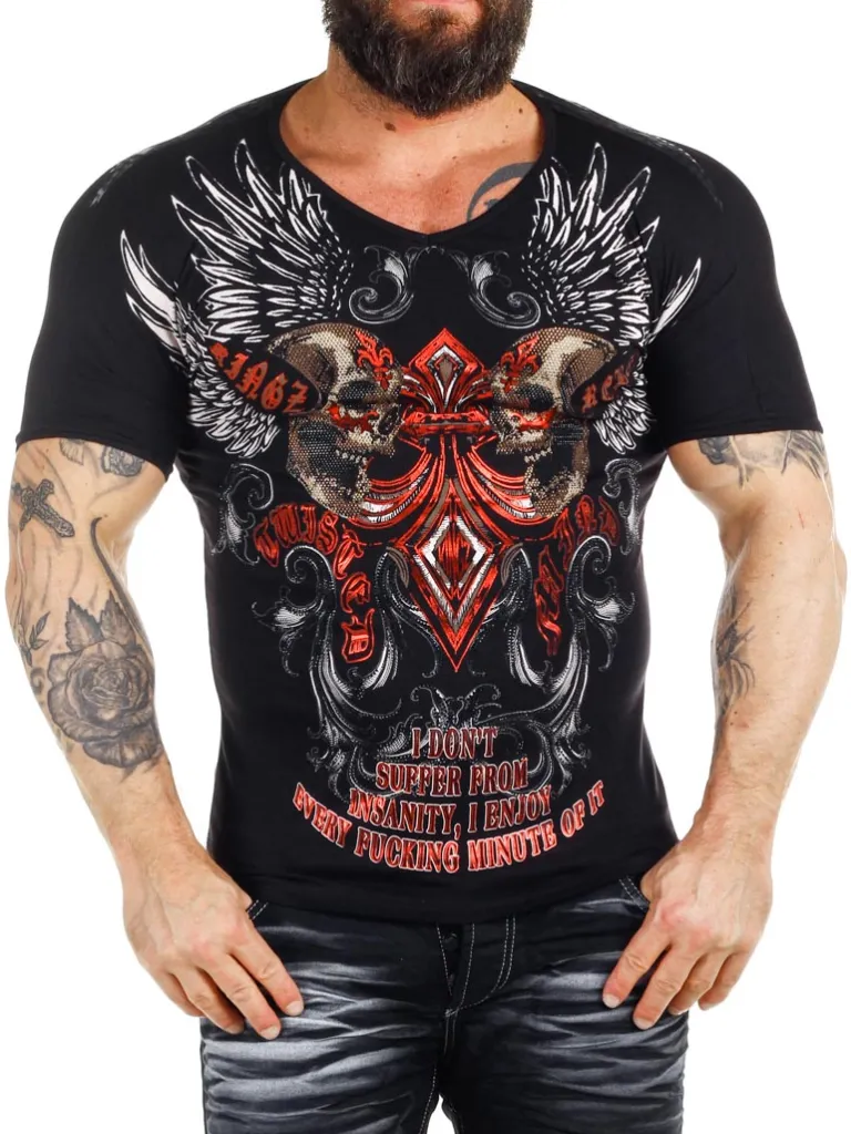 Hård T-Shirt Fra Kingzv-Udskæring Med Tryk Fortil Samt Bagpå Med Dødningehoveder, Mønster Og Sten. Den Har En Slank…