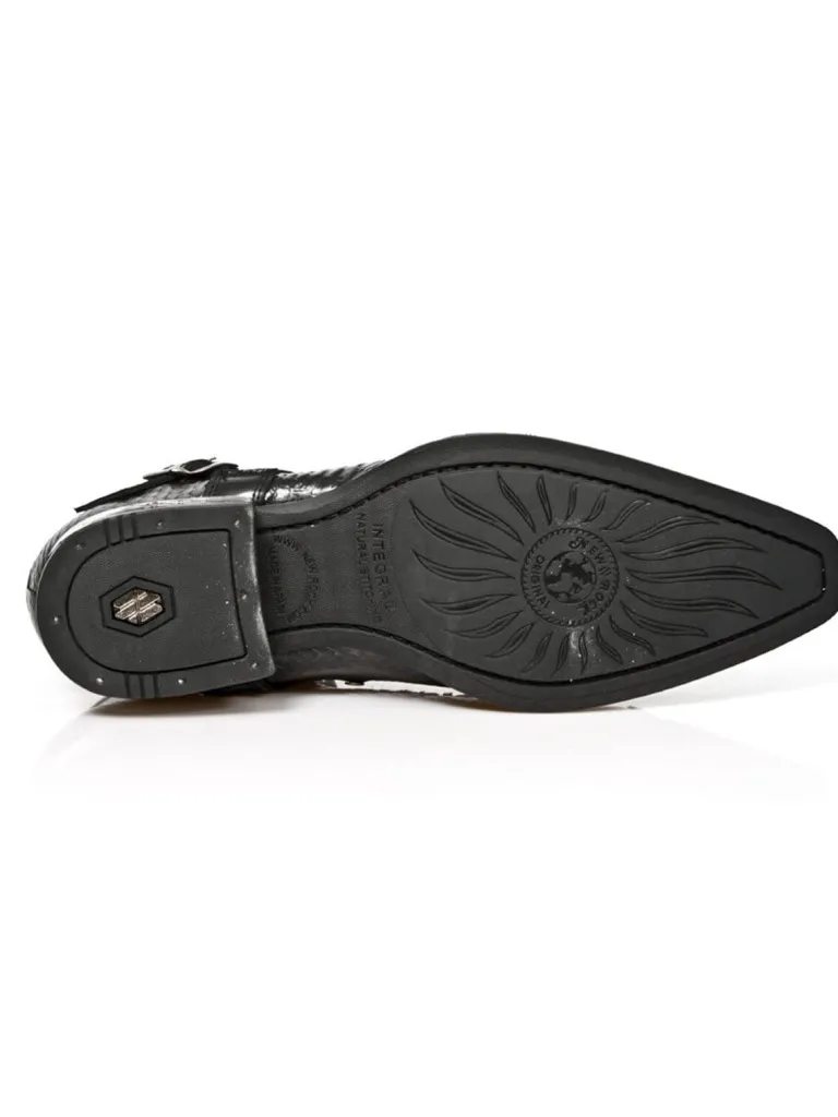 Lave Støvler Fra New Rocksorte Sko I Ægte Læder Med Mønster Og Lavt Skaft. Detaljerede Med Nitter Og Stropper I Elastik Med Spænde I Metal. Elastik Ved Skaftets Åbning, På Begge Sider, Hvilket Gør Det Lettere At Tage Dem Af Og På. Denne Unikke Sko Findes I Et Begrænset Oplag!