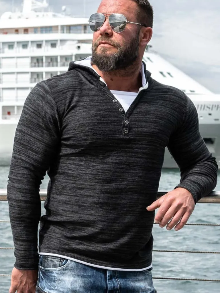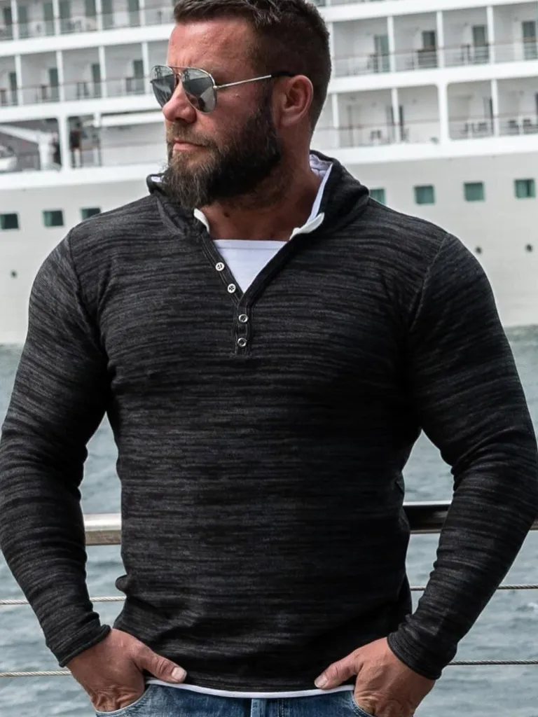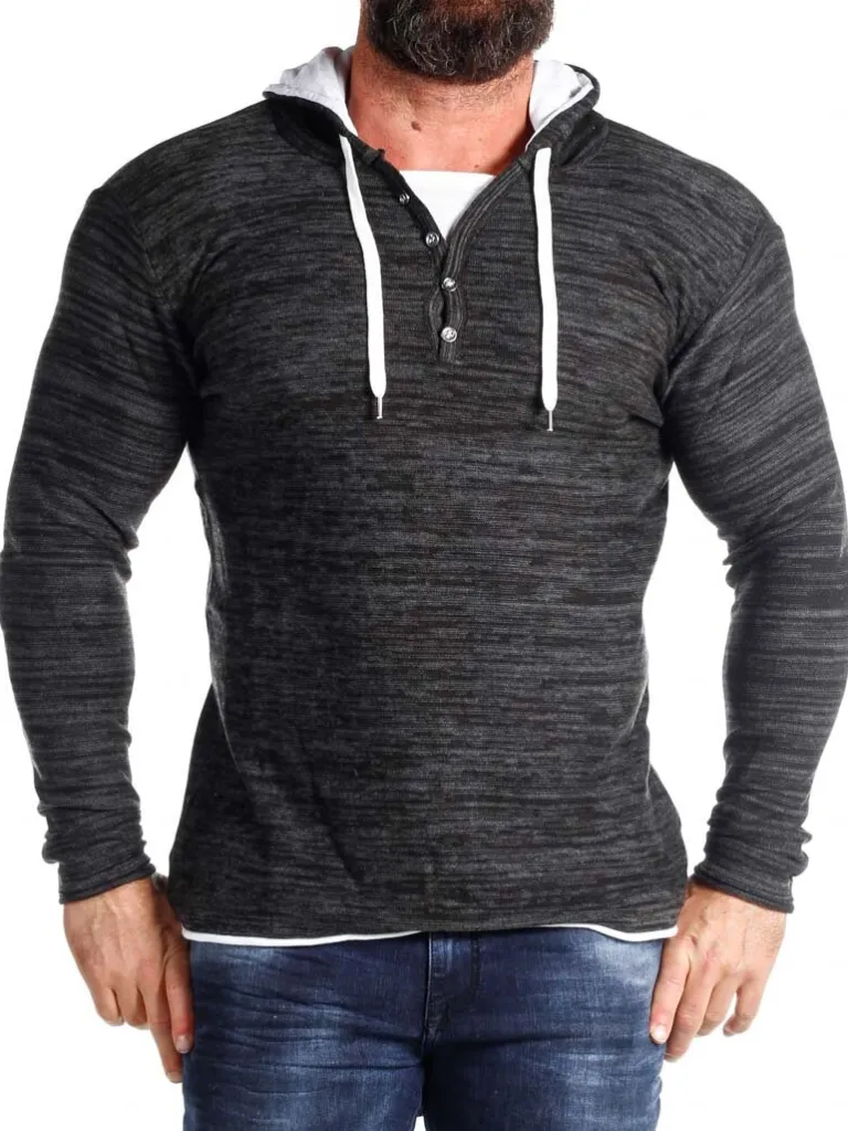 Finstrikket Hættetrøje Fra Carismasortgrå Trøje Med Hvide Detaljer. Den Har Knapper Fortil, Ved Halsens Åbning, Og …