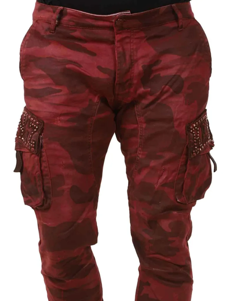 Bukser Med Sløring Og Nitterbekvemme Bukser Med Cargolommer Og Stretch I. Benene Bliver Smallere Ned Mod Anklerne, Hvilket Gør Dem Flotte At Bære Til Et Par Støvler Eller Ankelstøvler. Bukserne Er I Et Militærmønster I Rød Og De Detaljeres Med Nitter Og Et Skræddersyet Logo På Sidelommerne.