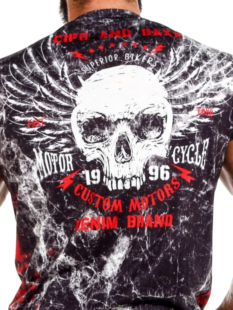 T-Shirt Med Tryk Af Dødningehoved Fra Cipo &Amp; Baxxmønstret T-Shirt I Sort, Rød Og Hvid Med En Rund Hals Og En God Pasform. Påminder Om Et Træningsmateriale Med En Bekvem Stretch.